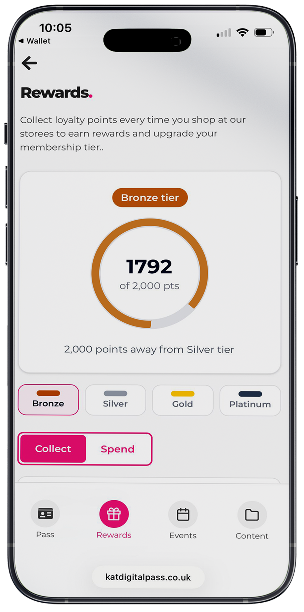 Whatever the size of your business, the KAT Digital Pass replaces paper stamp cards and plastic loyalty tags with a smarter, more sustainable alternative. Integrated with your EPOS system, it automates points collection, tiered rewards, and time-limited promotions, all visible instantly on your customer's phone.