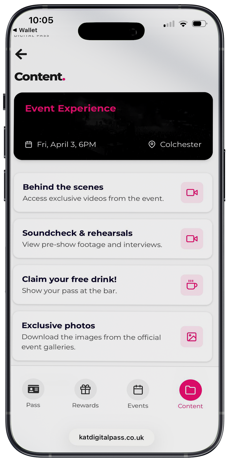KAT Digital Pass is a digital wallet platform that places your branded pass directly into Apple or Google wallet. Once stored, your pass becomes a live communication channel allowing you to send updates, rewards, offers and notifications straight to your audience's phone.